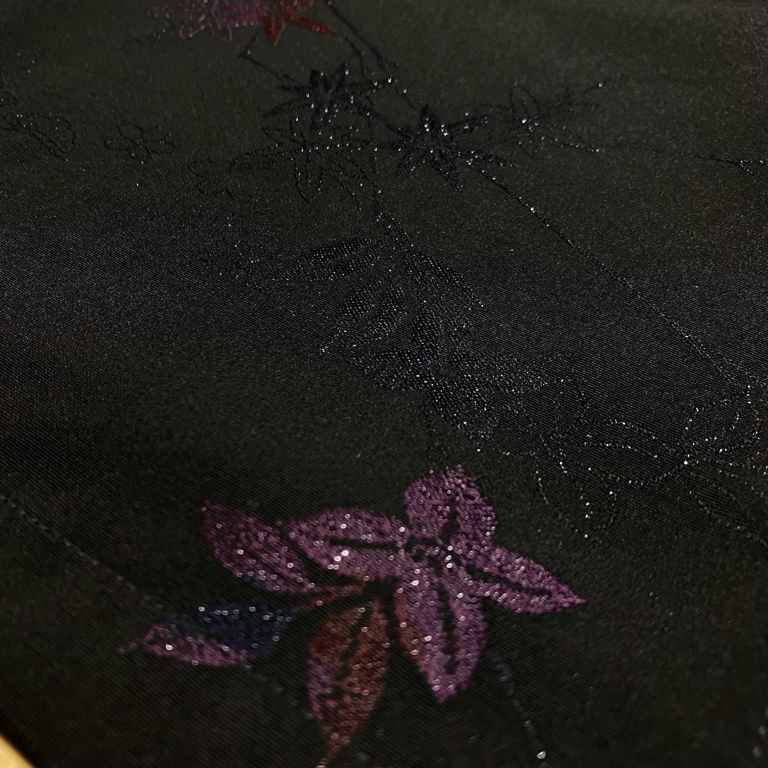 少し張りのある黒生地に漆で花絵が施されていてそのグラデーションが美しい