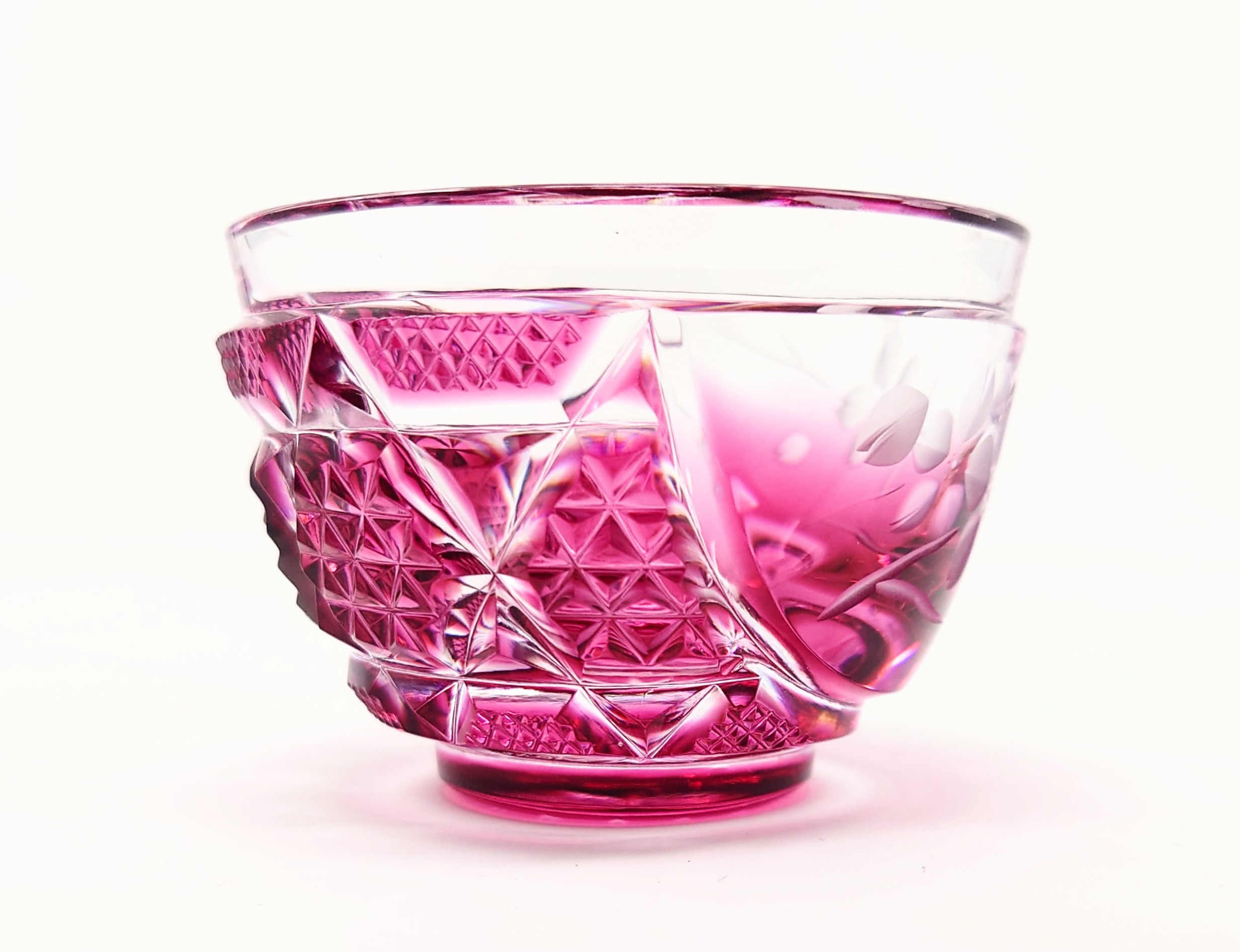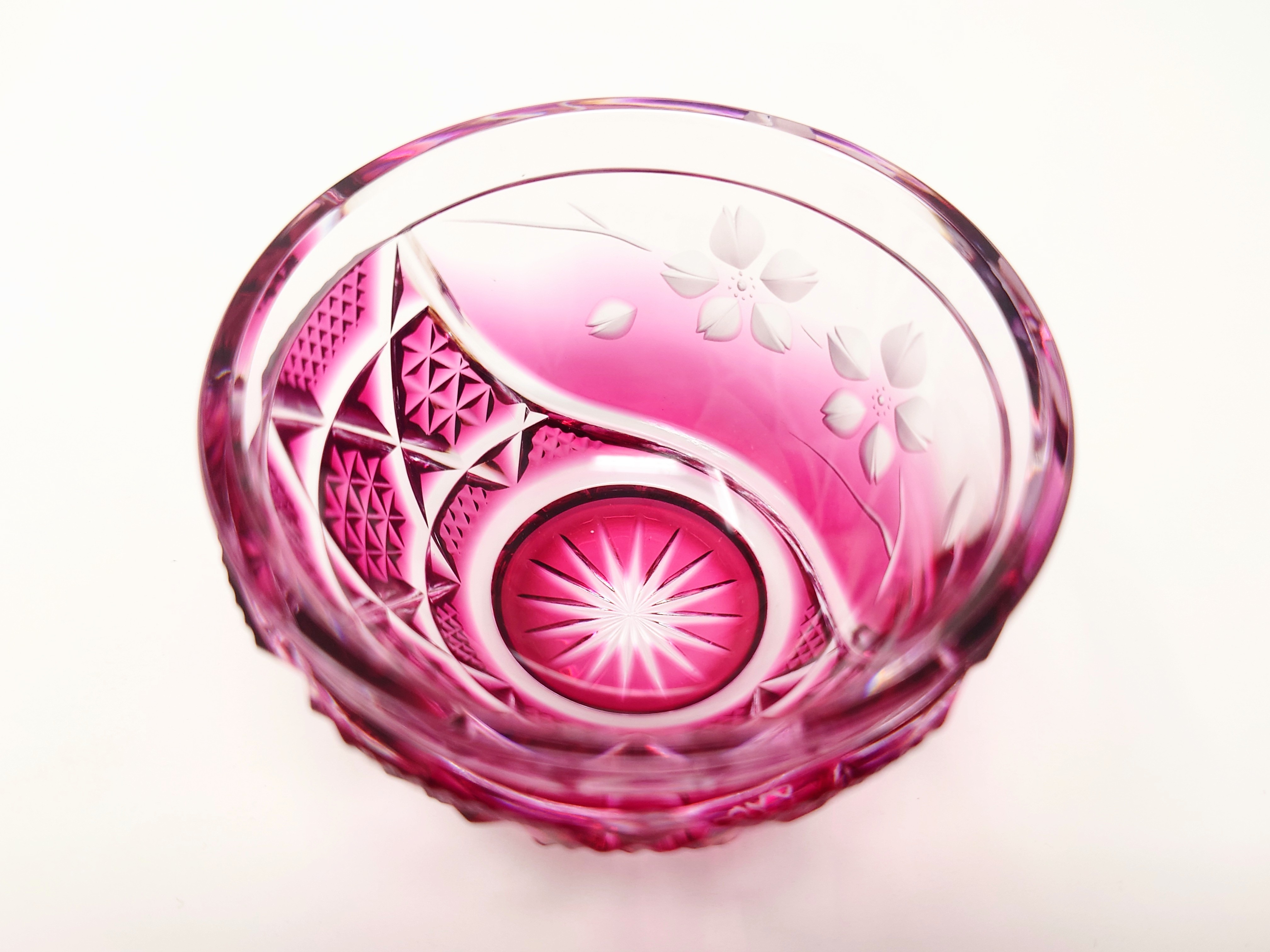 ガラスアーティスト 頌峰(しょうほう)による、この作品は、贅沢な桜の花が咲き誇る「花やか」︰金赤の薩摩切子です。透明と、深みのある赤とのグラデーションが施された、華やかな逸品です。