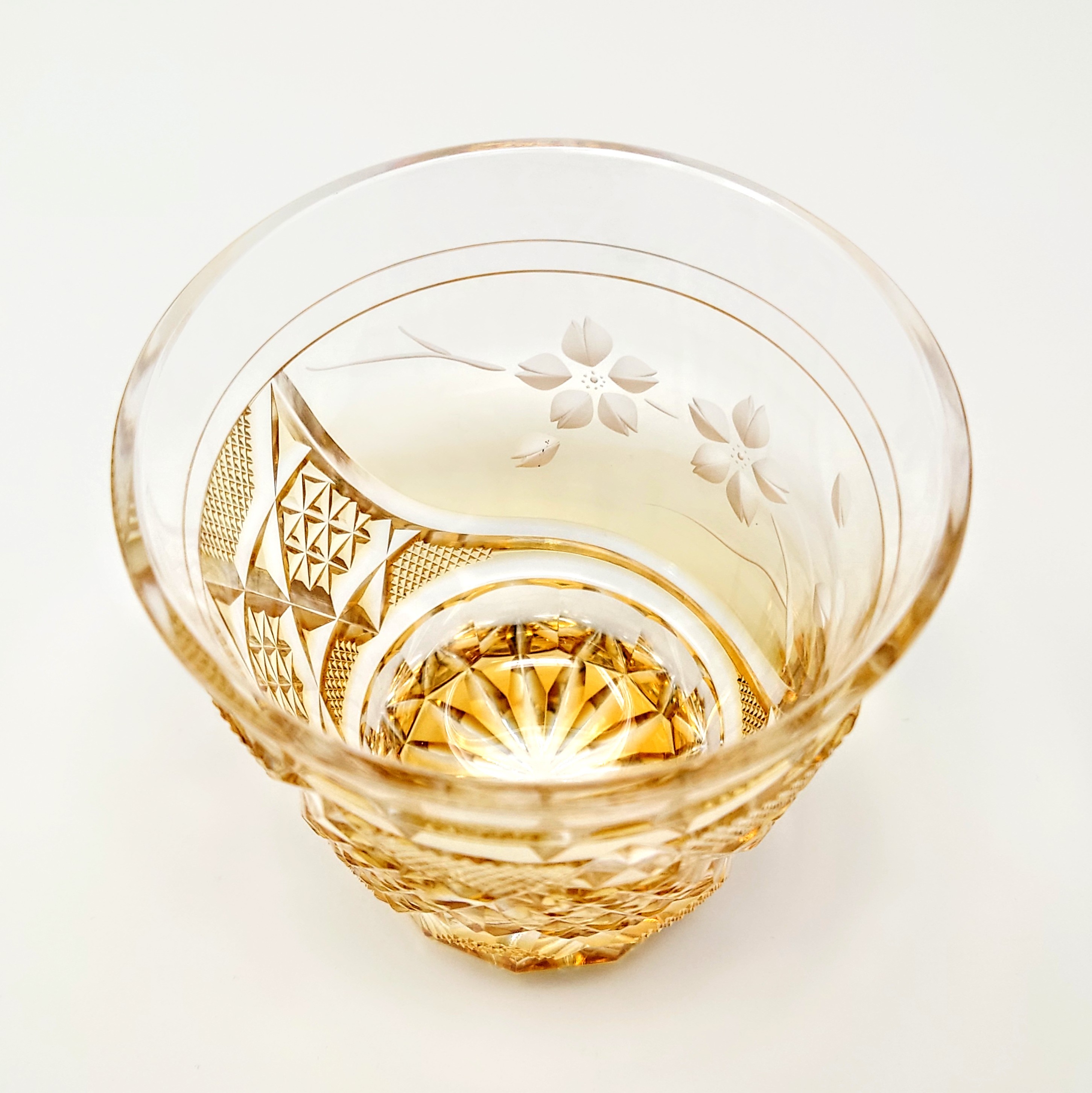 ガラスアーティスト 頌峰(しょうほう)による、この作品 オールドロック(ロックグラス)「花やか」は、桜の花やかなデザインと、天開型の形状で、ゴールドな色が特徴。