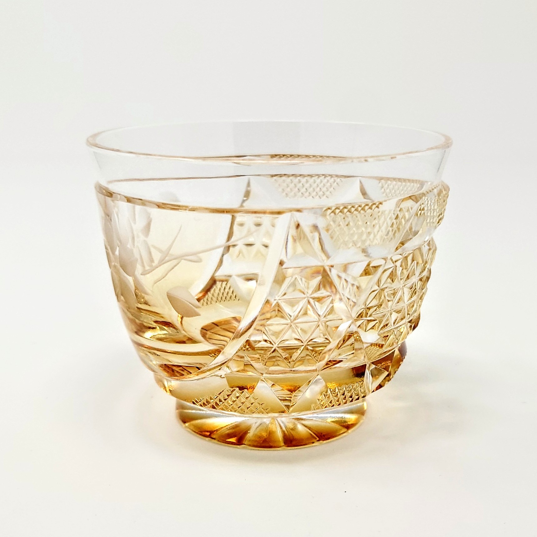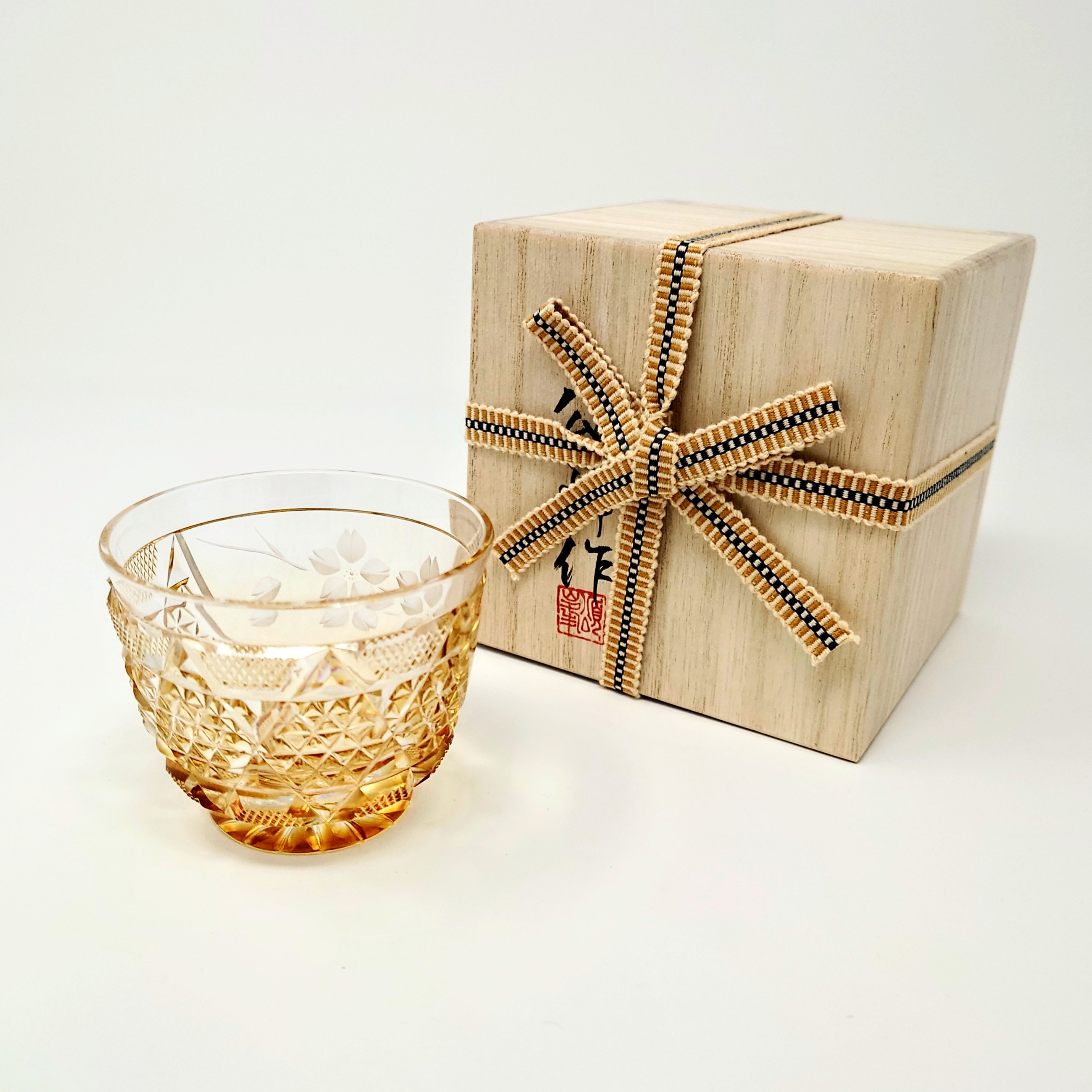ガラスアーティスト 頌峰(しょうほう)によるこの作品は、贅沢な桜の花が咲き誇る「花やか」︰ゴールドの薩摩切子です。透明と、深みのあるアンバー色ゴールドとのグラデーションが施された、華やかな逸品です。
