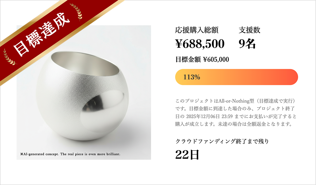 あなたが目にしている製品は、まだデジタル上にしか存在しません。 このクラウドファンディングが成功して初めて、東京銀器の職人が制作を開始します。