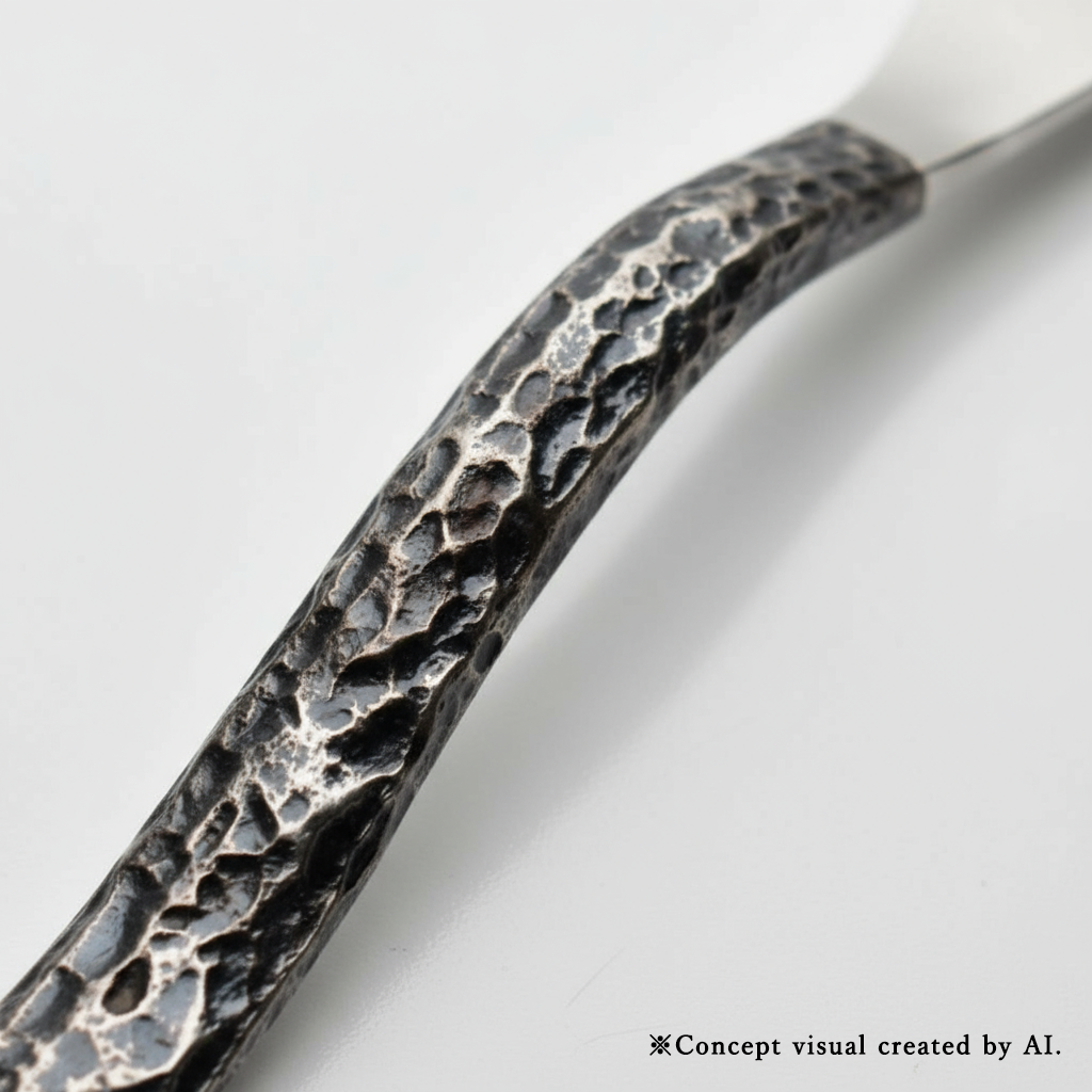 薄く仕上げられた刃は、熱を効率的に伝えます。槌目(つちめ)模様のハンドルは、滑りにくさと心地よい手触り、そして熱を保持する役割を果たします。