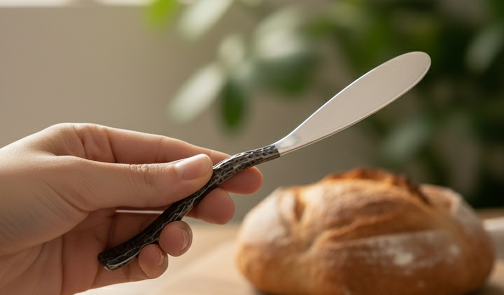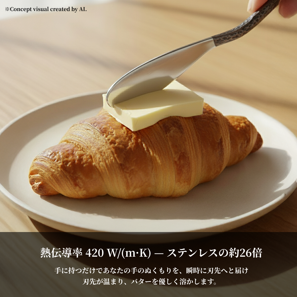 手に持つだけで、刃先が温まり、バターを優しく溶かします。