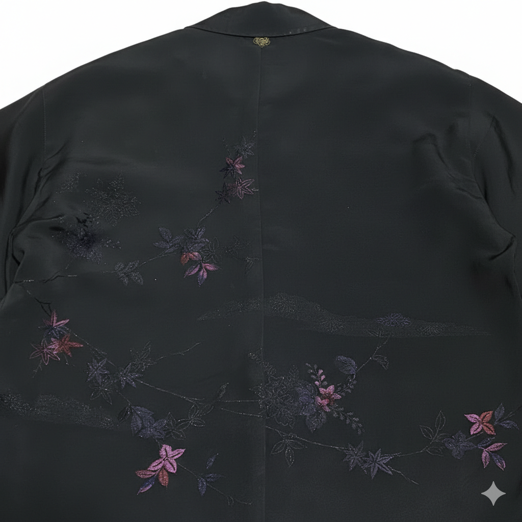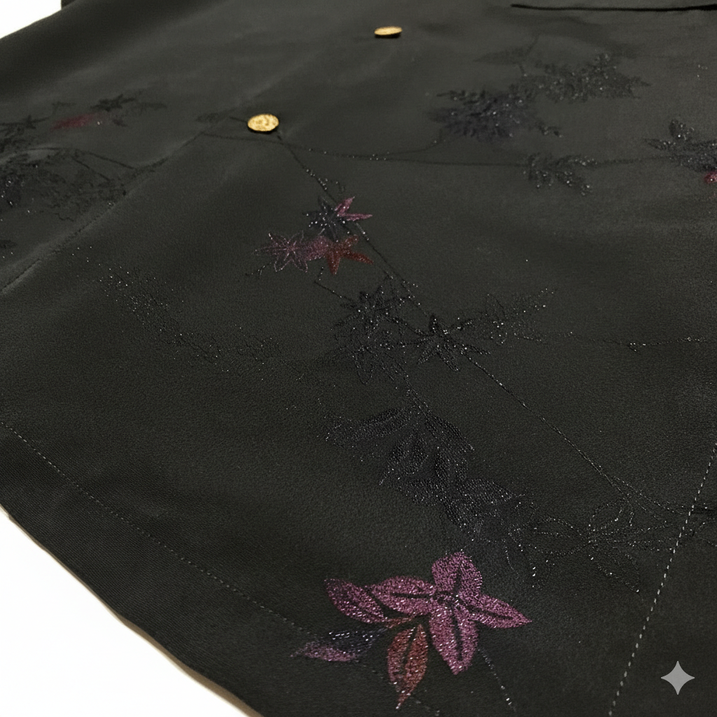 少し張りのある黒生地に漆で花絵が施されていてそのグラデーションが美しい